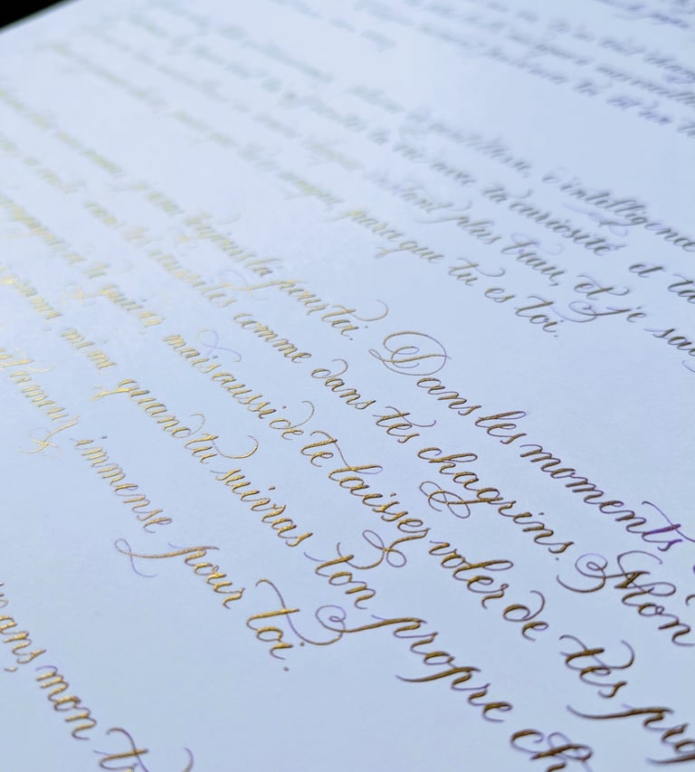 As an artist and calligrapher in Metz, I put my expertise at the service of your desires, creating cheerful and elegant lettering or illustrated creations that will impress your loved ones. Each piece is carefully crafted, taking into account your preferences and requirements. Whether you want refined invitations, glass engravings, or a keepsake picture, I'm here to bring your ideas to life.
